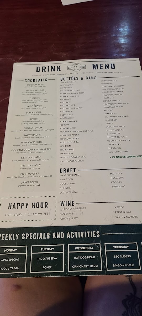 Welcome to Froggy & Jeffros, a hidden gem located in Spring Hill, TN, where comfort food meets a cozy atmosphere. The menu caters to all, featuring delightful options for kids and a selection of vegan treats. Kids can enjoy favorites like Ayden's Chicken Tenders and Abbey Lee's Grilled Cheese, served alongside crispy fries at accessible prices. For vegan diners, the Vegan Classic Burger and Vegan Cheese Fries shine as standout choices, showcasing innovative flavors.